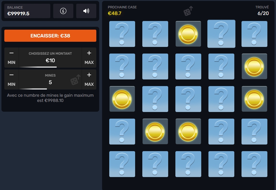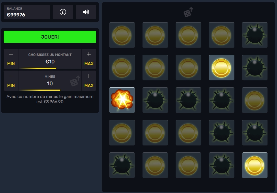 En installant beaucoup de mines, vous risquez de perdre de l’argent. Vous devez trouver une bonne combinaison de mise et de nombre de mines qui convient à votre stratégie de jeu.
